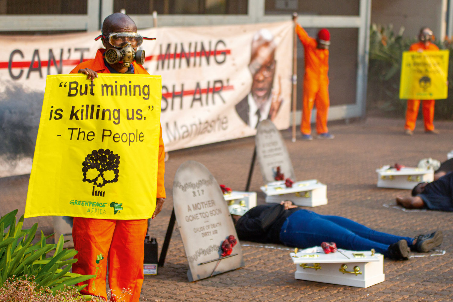 Bewohner:innen stark verschmutzter Regionen in Südafrika und Aktivist:innen von Greenpeace protestierten vor dem Umweltministerium in Pretoria. Mit einer eindrücklichen Aktion beklagten sie die tödliche Luftverschmutzung in dem Land und verlangten ein sofortiges Handeln der Regierung. Einer Greenpeace-Studie zufolge starben allein 2023 mehr als 42.000 Südafrikaner:innen an den Folgen der Luftverschmutzung. Sie ist vor allem auf die Feinstaubbelastung aus Kohlekraftwerken zurückzuführen.