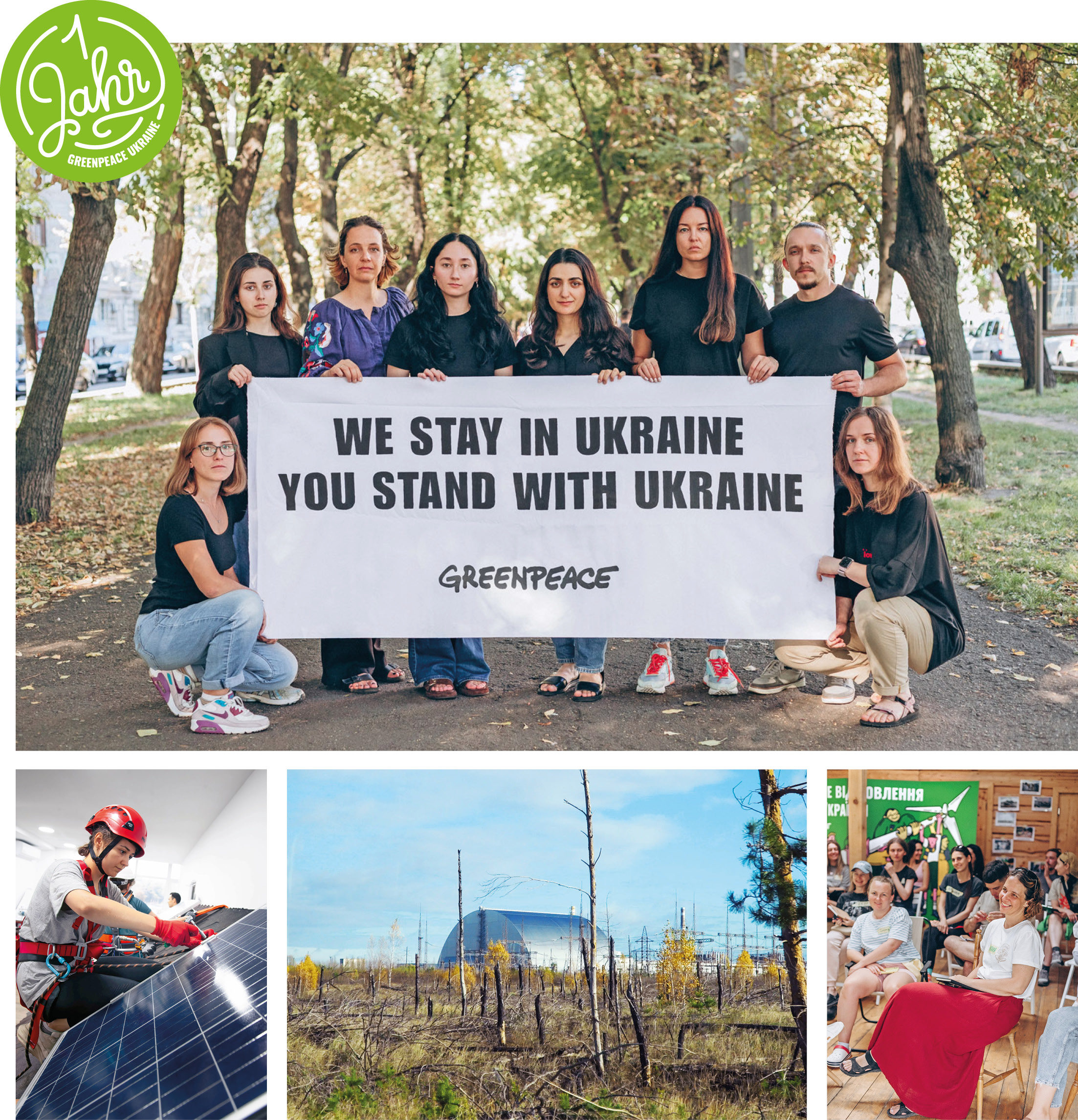 Es sind kaum vorstellbare Umstände – trotz Krieg im eigenen Land, häufigem Luftalarm und Sorgen um Freunde und Familie arbeitet das Team von Greenpeace Ukraine seit über einem Jahr im neu gegründeten Greenpeace-Büro jeden Tag für Umwelt- und Klimaschutz. Das Ziel: Eine starke, unabhängige, grüne Ukraine. Noch während Krieg und Zerstörung wüten, beginnt die Arbeit am grünen Wiederaufbau des Landes: So bildet Greenpeace Frauen darin aus, Solaranlagen zu installieren – Anfang November wurden die ersten in Betrieb genommen. Ein Projekt, das während des Krieges zu einer zuverlässigen Stromversorgung insbesondere für Krankenhäuser führt und zeigt, was möglich ist, wenn die Waffen schweigen. Wichtige Arbeit leistet Greenpeace Ukraine auch bei der Atomsicherheit. Im Spätherbst besuchte ein Team das Gelände des Atomkraftwerks in Chornobyl, um mit ukrainischen Wissenschaftler:innen die Strahlenbelastung des Kühlbeckens zu messen und Schäden zu dokumentieren, die der russische Drohnenangriff im Februar 2025 an der Schutzhülle des zerstörten Reaktors 4 hinterlassen hat.