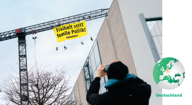 Die große Koalition aus Union und SPD wirft Deutschland energiepolitisch weit zurück. Aktive von Greenpeace leisten lauten Widerstand dagegen – wie hier im März am Kanzleramt in Berlin.