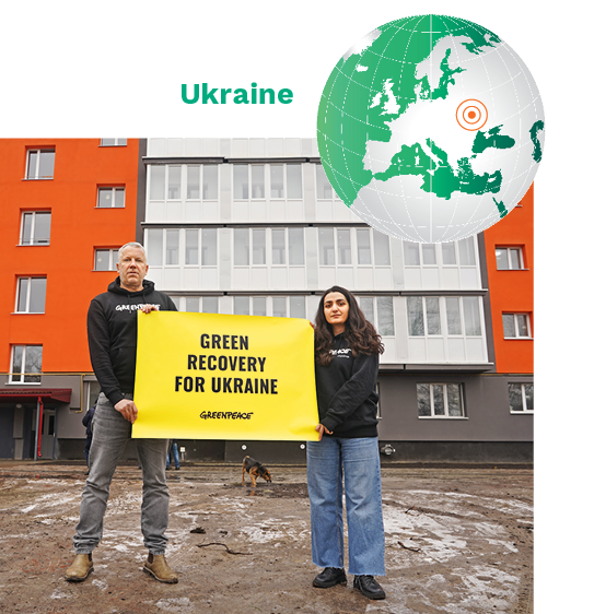 Wo die Umstände am schwierigsten sind, zeigt sich die Stärke der Erneuer-baren besonders. Im ostukrainischen Trostjanez wurde ein im Krieg beschädigter Wohnblock wiederaufgebaut. Geothermie, Solarstrom und Wärmepumpen liefern Energie für 60 Wohnungen. Das Pilotprojekt von Greenpeace Deutschland, der Ökostromgenossenschaft Green Planet Energy und der Umweltstiftung Greenpeace ist Teil eines Plans für grünen Wiederaufbau und zeigt, wie sich selbst große Wohngebäude klimaschonend versorgen lassen. In einem Land, dessen Infrastruktur regelmäßig Ziel russischer Angriffe ist, wird deutlich: Erneuerbare Energie ist widerstandsfähig – auch, weil sie dezentral erzeugt wird.
